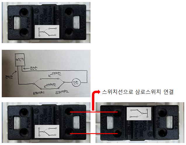 하나의 전등을 2개소에 껐다가 켤 수 있으려면 삼로스위치가 2개 필요하다. 삼로스위치는 위의 단로스위치와 앞면과 뒷면이 거의 다 똑같지만 아래 첫 번째 사진과 같이 배선도 그림이 다르다. 그림에서 알 수 있듯이 왼쪽 구멍 2개는 전기적으로 연결이 되어 있지만 오른쪽 구멍 2개는 서로 전기적으로 연결이 되어 있는 상태가 아니다. 스위치를 누를 때마다 한 번은 왼쪽 구멍과 오른쪽 위 구멍이 전기적으로 연결되고, 한 번은 왼쪽 구멍과 오른쪽 아래 구멍이 전기적으로 연결이 되는 것이다. 이러한 원리로 2개소 점멸 회로 구성에 대해 알아보도록 하겠다. 아래 두 번째와 세 번째 사진을 보도록 하자. 현재 연결 상태는 폐회로가 구성되어서 전등에 불빛이 들어오는 상태이다. 여기서 왼쪽 삼로스위치를 누르면 왼쪽 스위치는 위로 연결되고, 오른쪽 스위치는 그대로 아래로 연결된 상태여서 전기가 끊겨 전등에 불이 꺼진다. 이 상태에서 다시 오른쪽 스위치를 누르면 오른쪽 스위치가 위로 연결되어서 전등에 불이 들어온다. 따라서 2개소에서 하나의 전등을 제어할 수 있게 된다.
